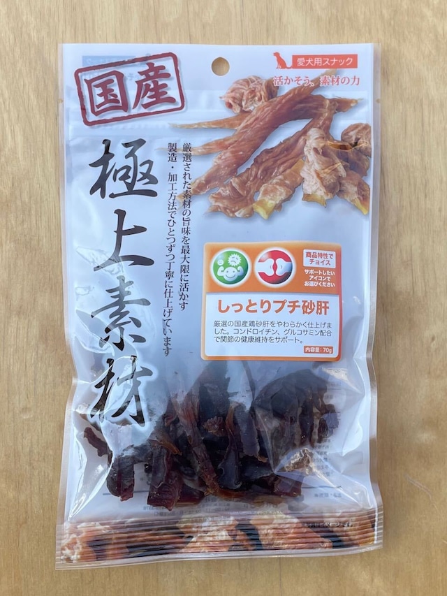 厳選の国産鶏砂肝をやわらかく仕上げました。 コンドロイチン、グルコサミン配合で関節の健康維持をサポート。 ○厳選された国産鶏砂肝使用。コンドロイチン、グルコサミン配合。 ○酸化防止剤不使用。合成着色料不使用。 ○素材の旨味を最大限に活かすため乾燥前の薬品による殺菌処理を行っておりません。 ○ワンランク上の原材料(人間用の食材と全く同じ品質)でこだわり志向の高まる飼い主さまの需要にお応えします。 ■原材料 砂肝、グリセリン、乳酸ナトリウム、リン酸塩、ソルビン酸カリウム、魚軟骨抽出物(コンドロイチン含有)、グルコサミン、ビタミンB1・B6 ■原産国 日本 ■内容量 70g ■成分 粗タンパク質35.0%以上/粗脂肪2.5%以上/粗繊維1.0%以下/粗灰分5.0%以下/水分30%以下 ■保存方法 お買い上げ後は直射日光をさけ、冷暗所で保存して下さい。 開封後は、温度・湿度に関わらず、必ず冷蔵して下さい。 ■取扱い上の注意 色・硬さ・形・臭いに若干の違いがある場合がございます。 また、少し変色したり、硬くなることもありますが、品質に問題はございません。 賞味期限に関わらず早めに与えてください。 ■価格 500円(税込550円)