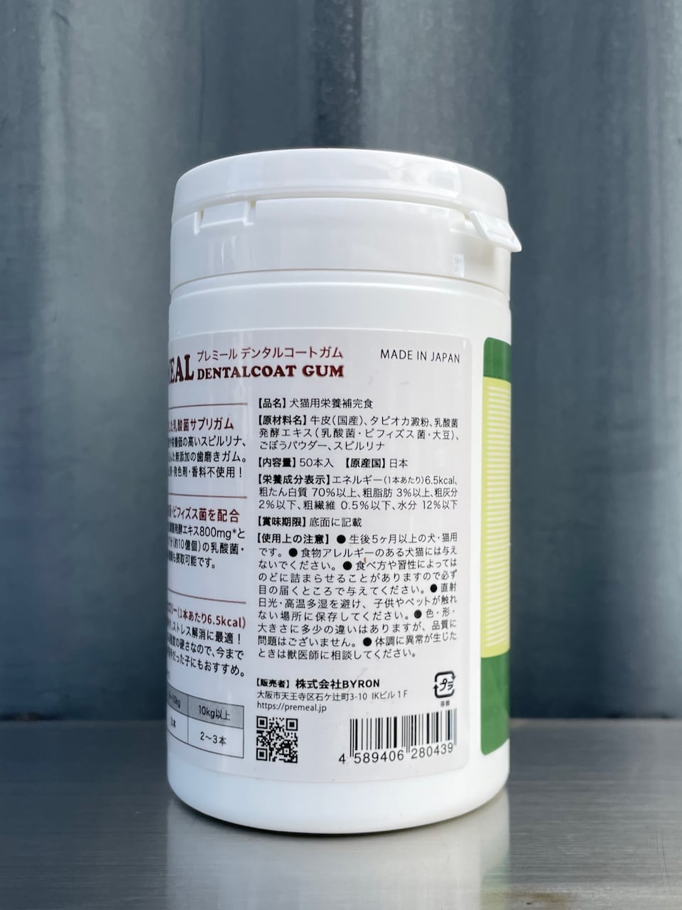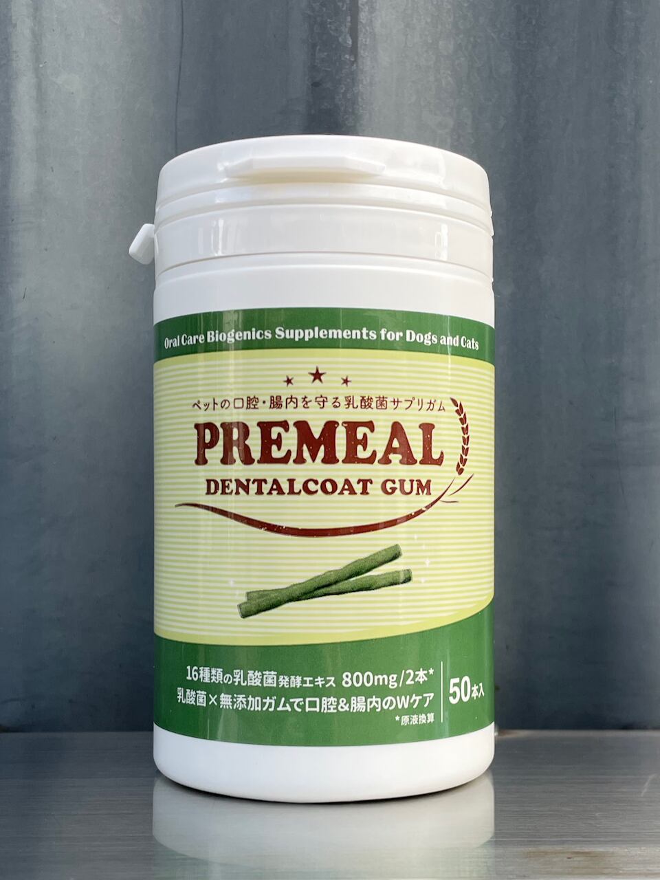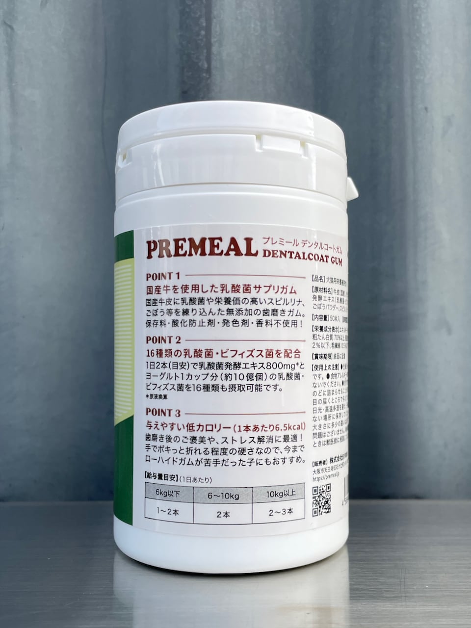 愛犬の口腔と腸の健康をサポートする「PREMEAL デンタルコートガム」は、国産牛皮を使用し、16種類の乳酸菌・ビフィズス菌発酵エキスを高配合した乳酸菌サプリガムです。