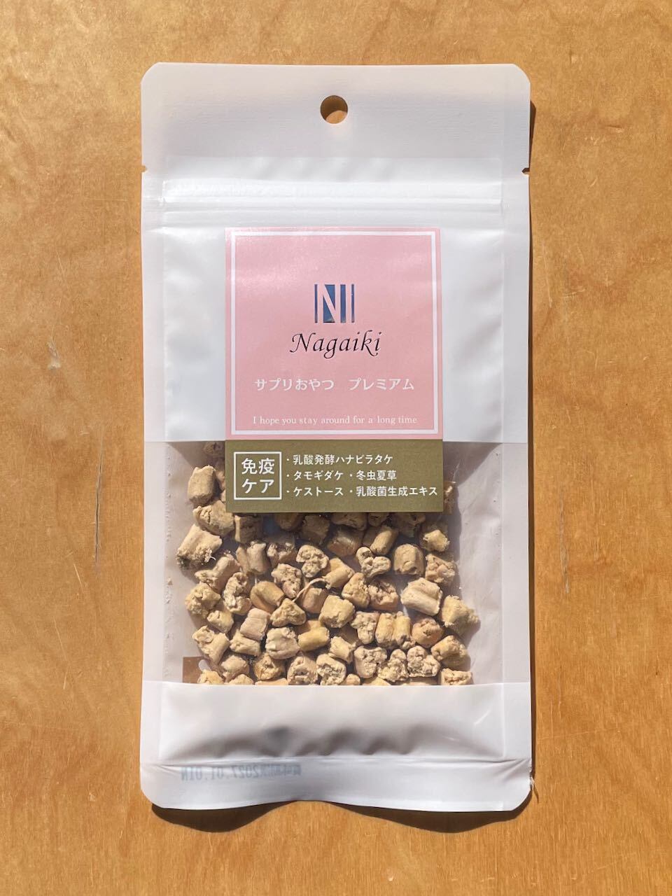 カジキ、米粉、乳酸発酵ハナビラタケ(100㎎/袋)、タモギダケ(90㎎/袋)、冬虫夏草(10㎎/袋)、ケストース(10㎎/袋)、乳酸菌生成エキス(0.18ml/袋)(原料換算)